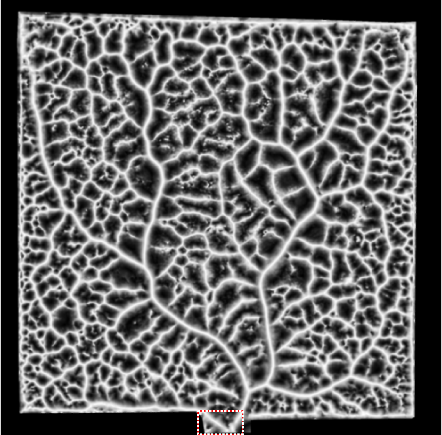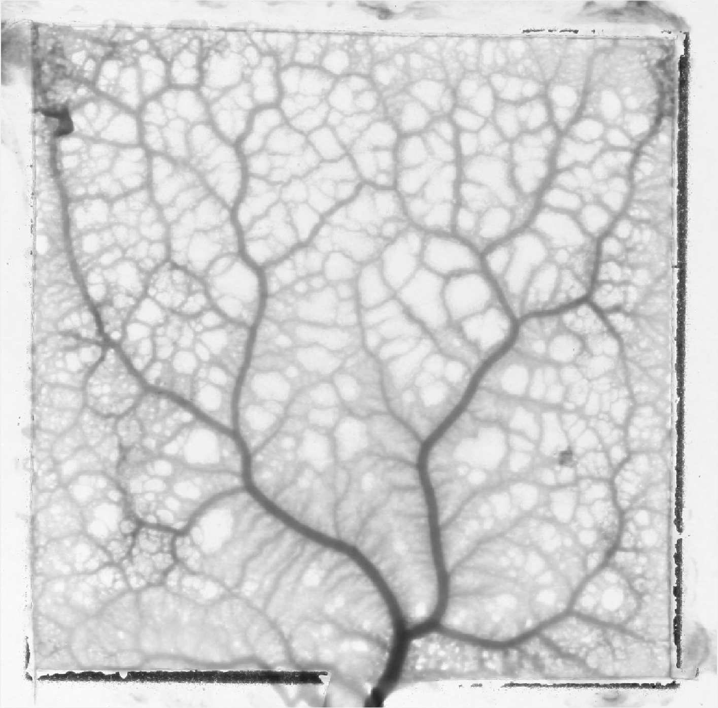 Topological measures of the network structure can also be extracted following conversion of the pixel skeleton to a weighted, un-directed graph, where nodes represent junctions and edges represent the veins that connect them. A range of graph-theoretic measures are then calculated, including predicted transport efficiency and betweenness centrality.The simplest method to identify the network would be an intensity-based segmentation of the transmission image to give a binary image, with ones representing the veins and zeros for the background. However, the resultant binary image is critically dependent on the value for the threshold used, and it is rare that a single threshold provides adequate segmentation without either losing dimmer structures if it is set too high, or artificially expanding and fusing adjacent regions if it is set too low. This is particularly problematic with developing networks in Physarum, as the veins form from retraction of the intervening plasmodial sheets, which make segmentation difficult until a well delineated network is present. Thus the approach adopted here exploits additional intensity-independent information over a range of scales and orientations to enhance the network structure, prior to segmentation as a single-pixel wide skeleton. The skeleton is then used as a template to interrogate the image locally to provide an estimate of the relative amount of plasmodium present and to provide an indication of the vein or sheet width.