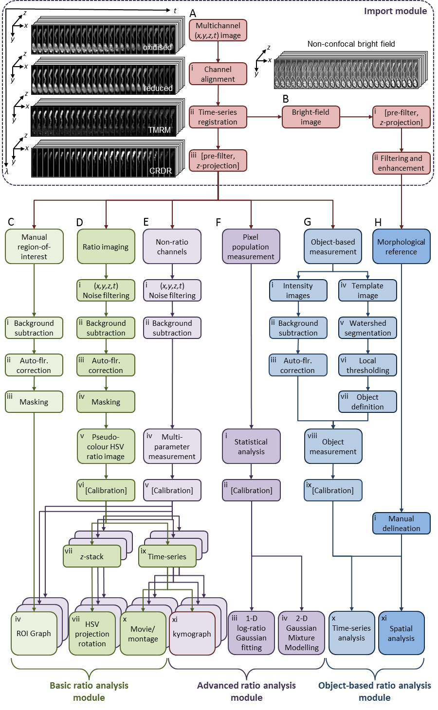 An overview of the software is presented in the schematic diagram below. Multi-channel, multi-dimensional images are loaded using the import module (red boxes), aligned, filtered and, if appropriate, the dimensionality reduced using projection algorithms. The Basic Ratio Analysis module (green boxes) is used to construct pseudo-colour coded ratio images, following background subtraction and auto-fluorescence correction. Measurements are made using manually defined regions-of-interest (ROIs). The Advanced Ratio Analysis module (purple boxes) extends the analysis to include multiple channels, and provides additional visualisation approaches, such as kymograph plots. There are also options to analyse the whole population of pixels using 1-D fits to the log-ratio data or 2-D Gaussian Mixture Models fit to the corrected intensity data. The Object-based Ratio Analysis module (blue boxes) uses a watershed segmentation, followed by a local intensity threshold to identify individual objects. The ratio values are then calculated from the average intensity for each object. The object ratios can be analysed as a population response, or combined with morphological information, such as cell identity or with distance from a spatial landmark, to correlate the redox behaviour with the cell response.